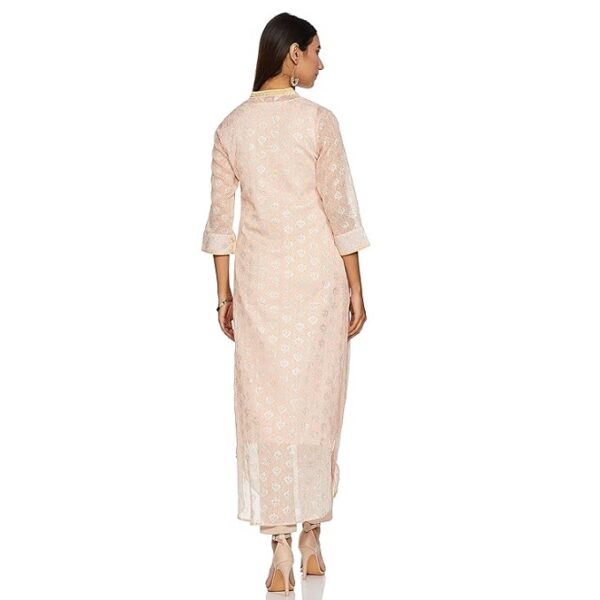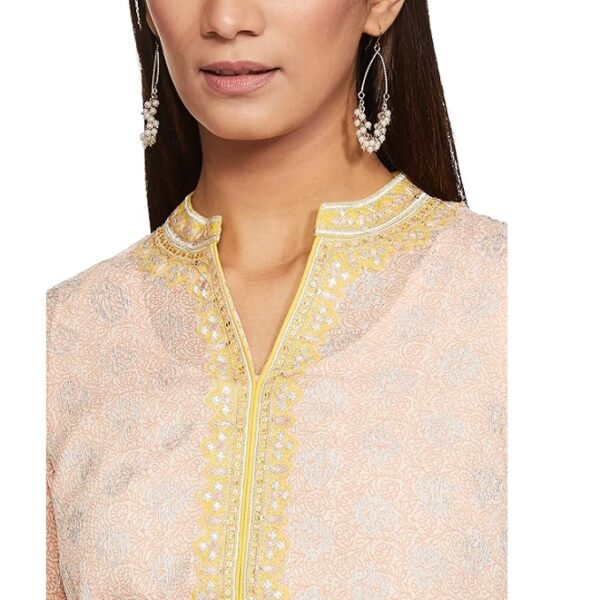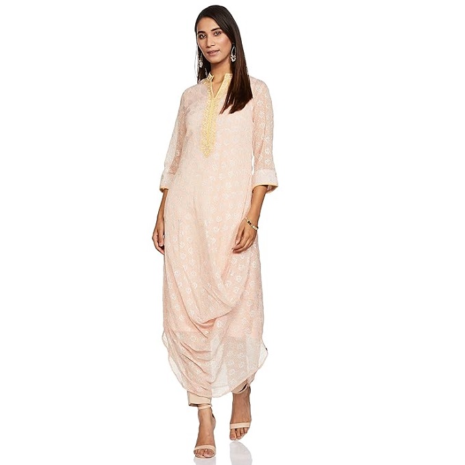 Look fabulous flaunting this peach asymmetric kurta. It comes featuring beautiful print all-over, contrasting placket and drape on the bottom front of the kurta. Take it home and team up with matching pants, earrings and shimmery heals.